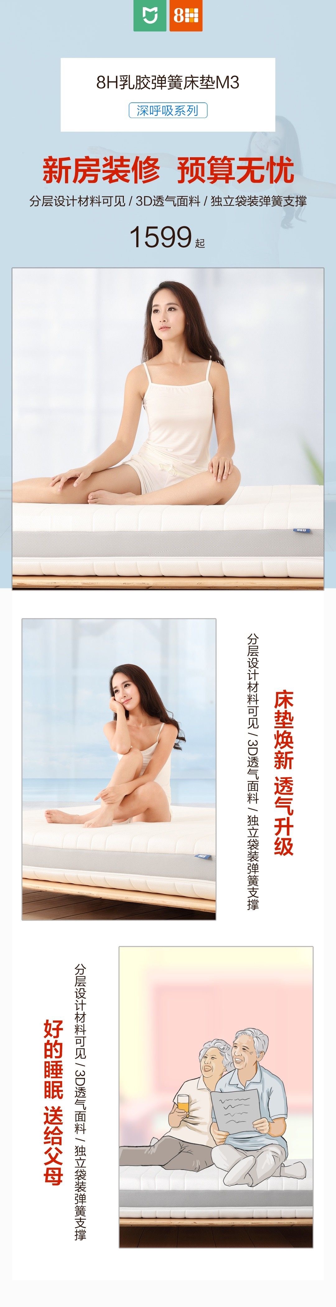 12月6日,一款会呼吸的床垫,登录小米众筹 阔别两个月,2月15日也就是今天哦 8H乳胶床垫M3将登陆米家APP进行销售 生活无小事,贴心送好物 上线期间更多好物相送