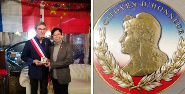 当天,黄建南还在桃花岛公馆获颁法国吉尼市荣誉市民勋章,大巴黎77省Jaignes市市长Achille Hourde向黄建南颁发了法国市民荣誉证书与奖章,表彰其为中法艺术文化交流所做出的贡献。当天,Achille Hourde市长夫妇、巴黎桃花岛公馆馆主郭义夫妇、旅法华裔古董艺术收藏家陆明夫妇、欧洲当代艺术家协会主席孙庆波、旅法著名策展人欣莉等中法艺术嘉宾应邀出席颁奖仪式并见证了这一时刻。