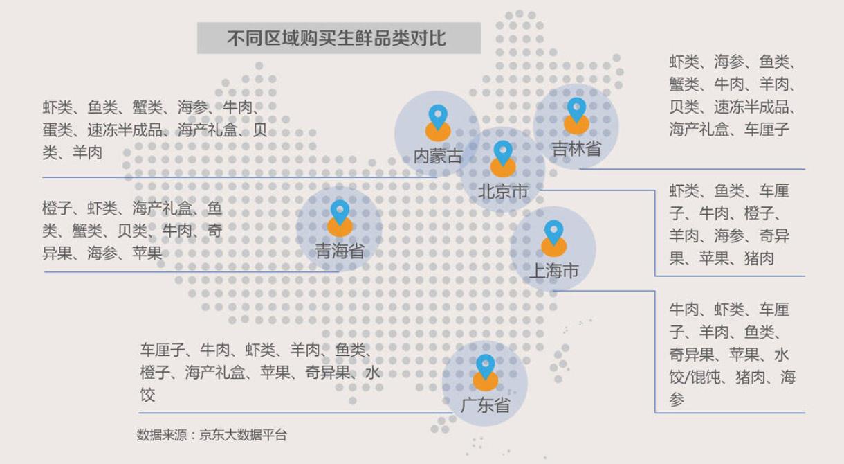 中国有句俗话说得好“民以食为天”。随着国人消费能力、生活水平的逐步提升,人们饮食结构及理念随之发生着翻天覆地的变化。 2月15日,京东携手21世纪经济研究院联合发布《“吃出来的中国年”——生鲜年货电商消费趋势报告》,通过对生鲜年货电商消费行为的综合比对分析,深度剖析“鲜”年货走俏背后蕴含的饮食结构变化,追求健康和高品质让高蛋白食材、进口商品备受追捧。 高蛋白食材增速高,健康观念普遍提升 随着我国经济体量的不断增长,国人的生活水平得到全面提升,我们的饮食结构也发生着翻天覆地的变化。人们不再只选择高油高脂的食物,而是越来越往精细化、健康化方向转变。报告中显示,海鲜水产超过肉类成为春节期间销量第一名,而观察全国消费者偏爱的生鲜品类发现,北京、上海、广东、内蒙古、吉林、青海等不同地区的消费者在购买生鲜产品时,新鲜水果、虾类、牛肉也均排名前列。