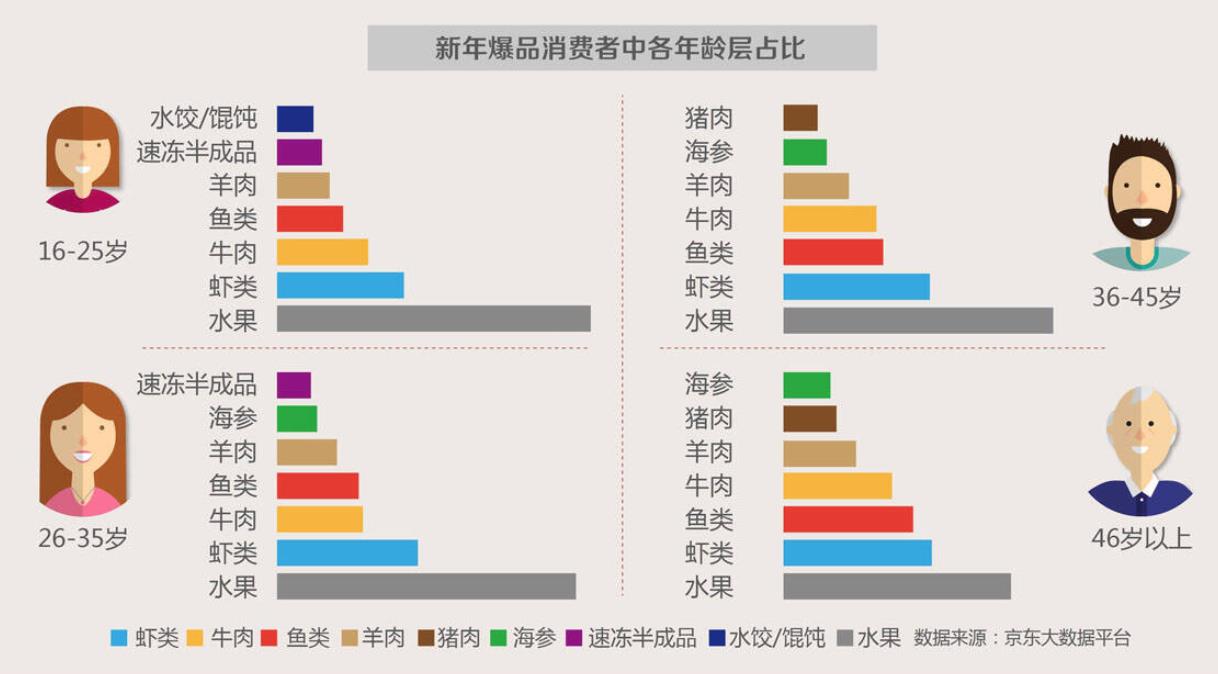 高蛋白食材、营养食材越来越受消费者青睐,营养膳食的健康理念已深入人心。在春节期间,水果礼盒、海鲜礼盒成年货成新宠,在注重自身健康的同时,也不忘为亲友送去关爱。 饮食结构多元化,男女老少各不同 在食品品类丰富、消费需求大幅增长的时期,消费升级推动饮食结构多元化加剧,由于消费群体性别、年龄层的不同,在生鲜消费上,也呈现出不同的消费特征。 就年龄层而言,中老年消费者更愿意为海参等高品质健康的生鲜买单,在客单价方面也是所有年龄用户中最高的;而80后、90后受生活快节奏的影响,较中老年人更易接受水饺、馄饨、速冻半成品等方便、快捷的速冻食品,也更愿意尝新,对进口水果的青睐度较中老年人更高。