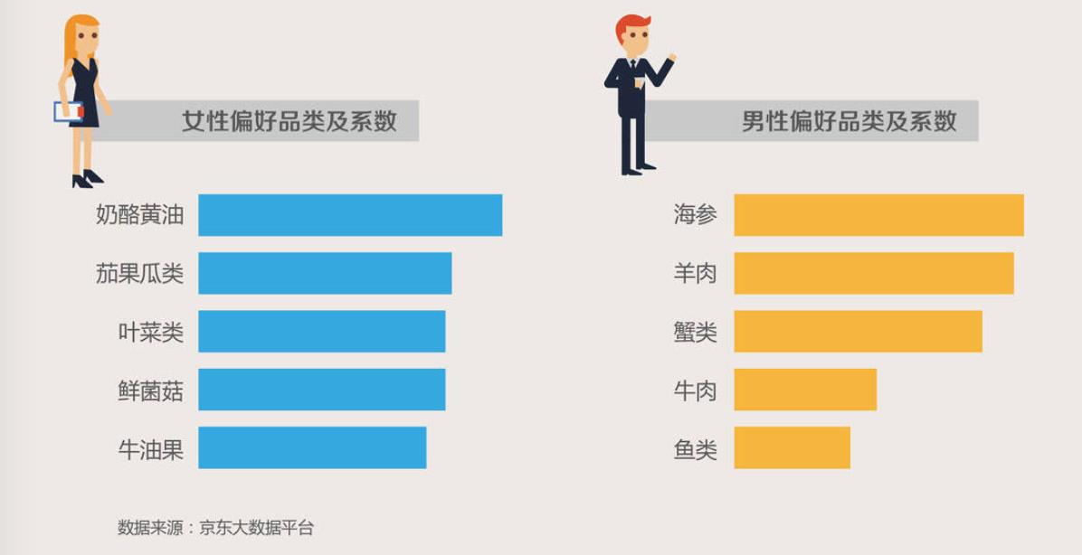 不仅年龄层在生鲜品类的选择上存在差异,性别上也呈现着明显的差异。报告中显示,女性较之男性更偏好购买水果、蔬菜、奶制品等素食产品,而男性明显更热衷购买肉食类硬货。