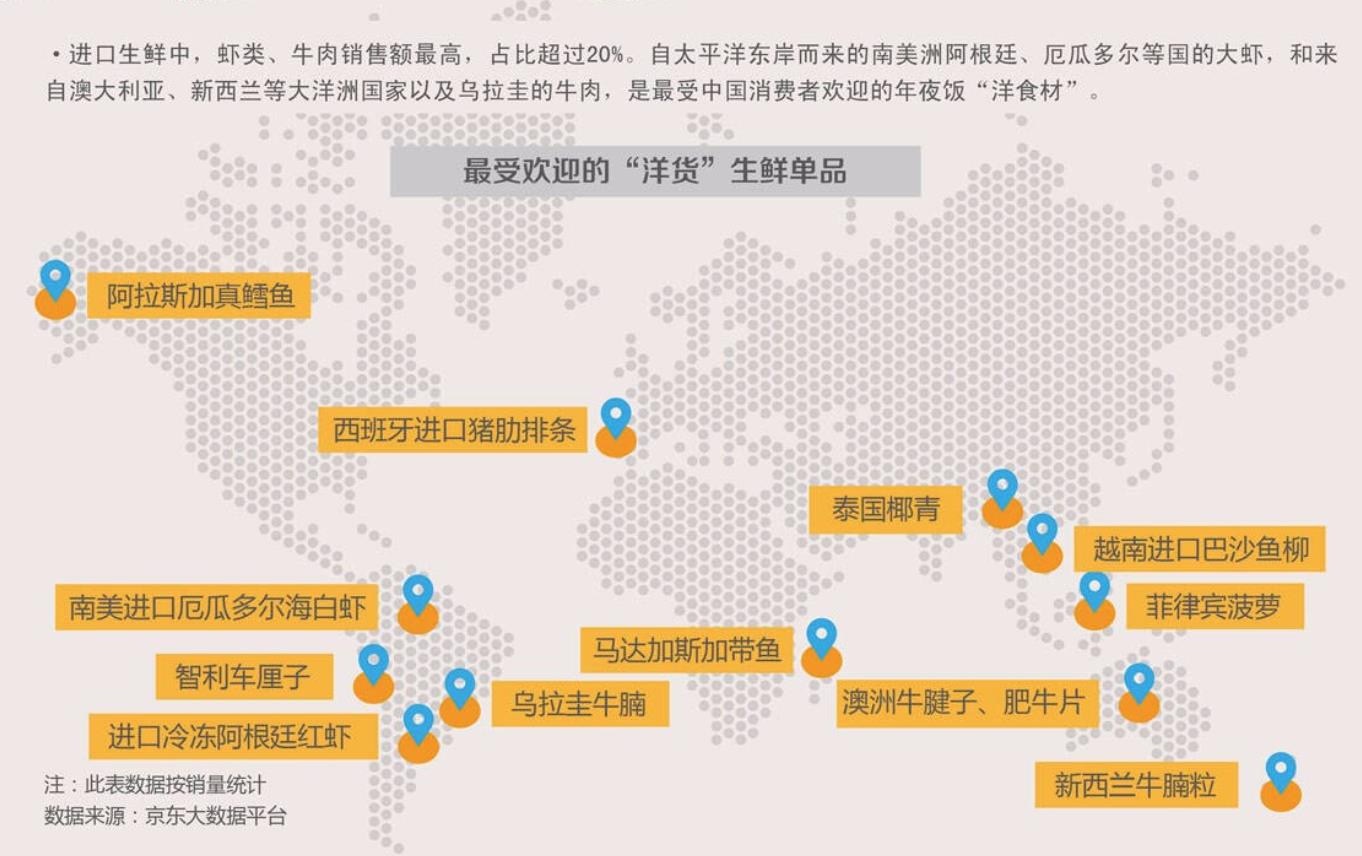 万里之外的“洋货”,成国人家常菜 透视社会变迁的窗口,更多“新潮”生鲜年货映入消费者眼帘,诸多进口生鲜挤进老百姓的餐桌,让平民老百姓吃上不远万里而来的新鲜“洋货”。数据显示,阿根廷等国家的大虾、澳大利亚等国家的牛肉,都是国人年夜饭餐桌上的常客。