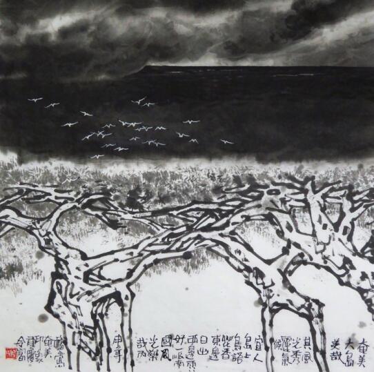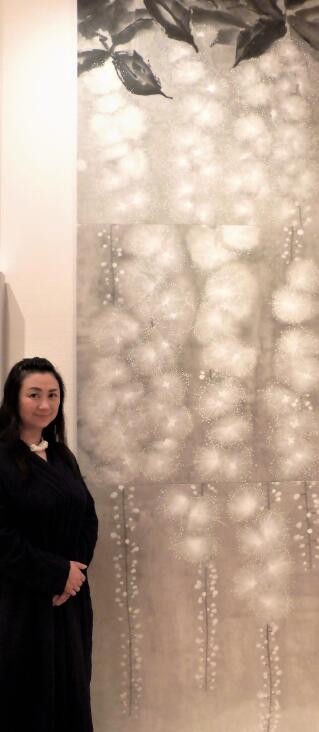 曾令富作品《亘古》 画家曾勤在作品《一花一世界・幻》前 ■曾勤艺术简历 ・日中现代墨画会会长 ・日本美术家联盟会员 ・日本中国文化交流协会会员 ・国际水墨芸术大展审查员 ・日本国立电视台NHK文化中心讲师 ・日本读卖新闻・日本电视台文化中心讲师 1992年由四川美术学院本科来日留学。后深造于中央美术学院。现定居日本。师从日本画坛巨匠片冈球子的弟子新公子先生学习日本画。 20多年来,一直致力于日中文化交流,创办了日中现代墨画会,任会长,在日开办了多个水墨画教室,传授、推广、普及中国传统水墨画。并在小学、敬老院等进行义务教学水墨画。 多次组织日中国际书画大展,得到了日中两国活跃在画坛的书画名家们的大力支持踊跃参展,日中现代墨画会的会展作品集由日本著名出版社《日贸出版社》出版发行。 曾勤多年来赏试中国画与日本岩彩画的结合与创新。多次在东京银座《鸠居堂画廊》举办曾令富・曾勤・曾黎父女三人展和个人画展。田中一村记念美术馆举办父女三人展等。东京艺术大学美术学部部长池田政治先生称“曾勤掌握了中国画的传统技法、又吸收了日本画的技法,创造出独自的绘画世界・・・” 个人作品集『一花一世界』由日本著名美术出版社《求龙堂》出版发行。日本国立新美术馆、东京艺术大学、日本女子美术大学、日本国立国会图书馆等及各地博物馆、日本图书馆相继收藏。全媒体大型人物故事专访节目《逐梦他乡重庆人》进行了专题报道。
