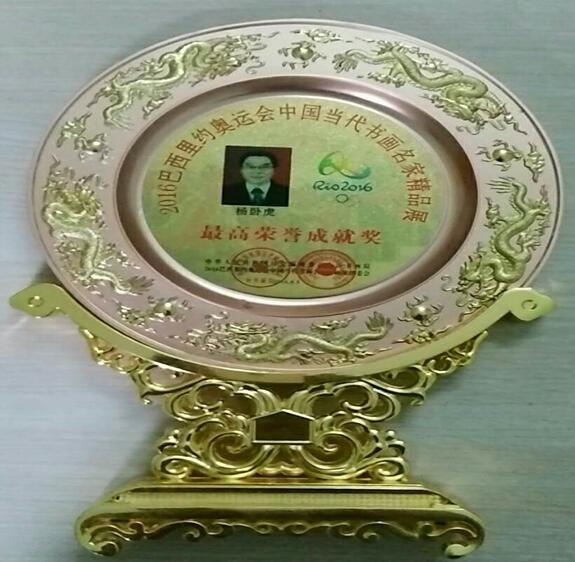 杨卧虎先生的作品和个人传略还同时入编《世界美术集》(书法卷)、《世界美术家传》、《中国专家人才库》和《百年经典一中国书法全集》等。 近年来,杨卧虎先生的书法艺术成就又达到了一个新的高峰,在国内重大的书画大赛和书画精品展中,屡屡载获大奖: 在2015年纪念抗战胜利70周年阅兵庆典书画展中,杨卧虎先生的两幅作品《毛泽东诗長征》、《沧海横流方显英雄本色》荣获金奖;获奖作品入编《中华翰墨书画名家大典》,作品还参加了多个国家的巡展,被美国旧金山中国人民抗战纪念馆珍藏;还授予杨卧虎先生“中国爱国书法艺术名家”荣誉称号。 在2016年巴西里约奥运会中国当代书画精品展中,杨卧虎先生的两幅作品《拼搏》、《书山颂华夏》,荣获“走向世界的中国当代书画名家最高荣誉成就奖”,获奖作品入选巴西里约奥运珍藏版书画特刊《龙之魂——走向世界的中国当代书画名家》,并与中国书画界的泰斗黄永玉,范曾大师并列荣登特刊封面;作品在世界多个国家展出,并被巴西圣保罗艺术博物馆收藏(陈列)。 在2016迎神十一载人航天飞行成功中国当代书画名家精品展中,杨卧虎先生的两幅作品《喜迎神十一飞行成功》、《兰亭序句》荣获金奖,并入编《飞天梦、强国梦、中国梦——中国当代书画精品大典作品集》,作品在多个国家展出,杨卧虎先生的作品被中华航天艺术博物馆收藏,与此同时,并授予“中国载人航天艺术成就杰出贡献艺术家”荣誉称号。 中国的书法艺术,传承了中华民族文化的灵魂。 杨卧虎先生的书法,为中华文化瑰宝增添了光彩。