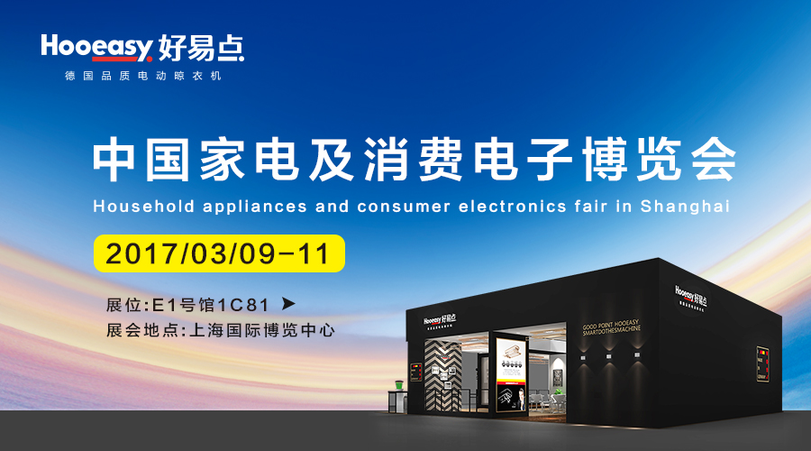 中国家电及消费电子博览会(上海) 先进的科技是第一生产力,此次3场展会都将汇集好易点各个系列最具代表款式,全面展示好易点各款系列的特色和风格,为来自全国各地的经销商们展示好易点智能晾衣机领先的科技和精湛的技术,领略独特品牌魅力!