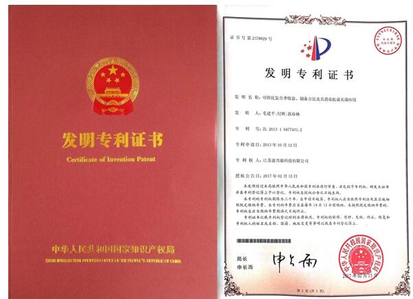 2017年2月15日,国家知识产权局发布通知,江苏惠兴康科技有限公司申请的“可固化复合季铵盐、制备方法及其消毒抗菌灭菌应用”喜获国家发明专利。目前此专利技术广泛应用于久洁灵长效消毒产品系列,并已经成功面市,填补了国内在长效消毒技术领域的空白,实现了长效消毒技术在国内的首次应用。