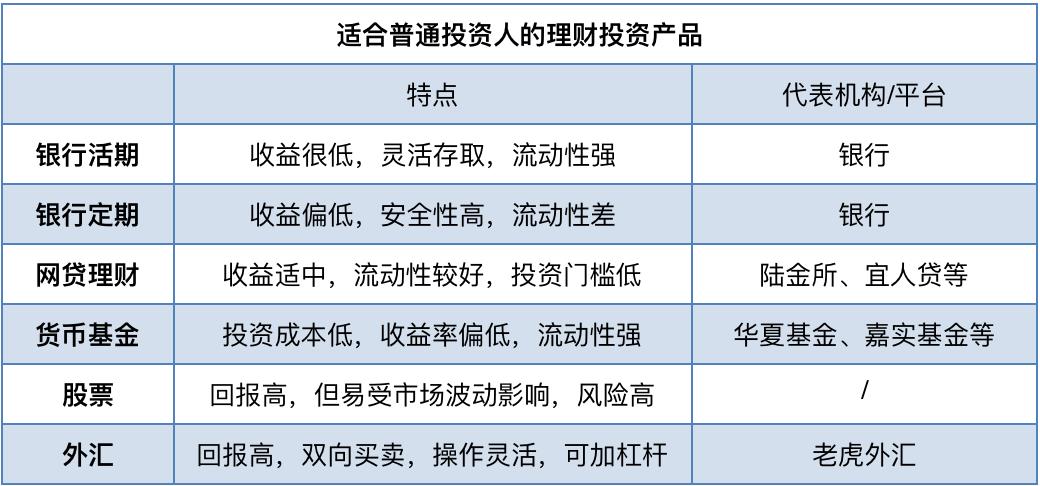 根据粗略统计,这些娱乐明星们的投资,除了涉猎房地产、餐饮业、画廊、文化公司、影视剧等传统模式外,近几年,也越来越向增值最快的资本市场靠拢,敢于把握互联网时代高速发展浪潮,根据自己的喜好选择一些新兴的互联网创业项目。 如宣布息影专心做投资的“公孙策”任泉,除以其个人名义投资的项目外,他和李冰冰、黄晓明等人成立的“StarVC”,先后投资秒拍、韩都衣舍、明星衣橱等多个新兴互联网项目,可谓开了明星创立专业投资机构的先河。 除此之外,明星们还乐于充分发挥并利用自身得天独厚的资源优势,偏爱与商业领域大佬们合作。如邓超在2014年就加盟了创投大佬、360公司董事长周鸿祎的“蒲公英创业计划”,和周鸿祎、真格天使投资基金徐小平、导演俞白眉三人一起担任创业导师,寻找“中国好应用”,对安卓应用APP开发者提供全程资源支持。李亚鹏退出娱乐圈后专职“投资+创业”,2014年加入黑马基金,和徐小平、王石、俞敏洪等投资界大佬一起成为有限合伙人之一。 当然,由于任何投资都有潜在的市场风险,因此明星们在资本运作上也呈现出立体化运作多点开花的特点,注重资产的多元化配置,分散风险。如黄晓明的投资触及影视、红酒、服装、高尔夫球、互联网等多个领域,版图一直在稳步扩展,是娱乐圈出了名的投资高手。 总体而言,明星们作为公众人物,拥有众多的粉丝和超强影响力,做投资具有很大优势,但卸下名人光环,他们其实也和普通人一样,渴望获得更加稳定、持续的财富增值之道。 对普通人而言,虽然没有如明星们一般巨大的财富和资源实力,但也可根据自身收入支出情况合理规划。因为在经济高速发展、消费升级的当前社会,合理的资产配置和投资方式是每个人必修的课题,是我们获得品质生活的一种智慧方式。下面笔者简单筛选了几种比较适合普通投资者的理财投资产品,仅供大家参考: