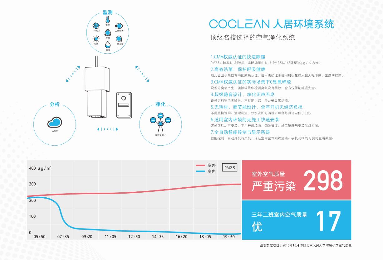 科技日报报道:“记得有人说过,创业目的不是颠覆,而是为了让世界变得更美好。所以,带着这个愿望,我义无反顾地选择回国创业了。” 当各界还在争议究竟是空气净化器还是新风系统更适合学生教室安装和使用环境的时候,Coclean众清科技团队已经把他们的负氧离子空气净化系统悄悄地安装在了人大附小主校区、清华李兆基楼、河北邢台幼儿园等数十所教育机构的教学办公区内,覆盖了近10万平方米的公共空间。 2月27日下午,科技日报记者采访了Coclean创始人赵飞,希望从其创业思路和经历中一窥Coclean的成功之钥。采访中,这位清华学子、留美博士表现出了一个理工科高材生特有的严谨和务实。在他看来,创业之路用十二个字就能概括:切口不大、思路明确、技术过硬。 “因为我们更好地解决了刚需问题” 正如硅谷创投教父、PayPal创始人彼得·蒂尔(Peter Thiel)所言,创业要学会在“危机”中发现“生机”。无论能源如何稀缺、技术如何发展,只有对特定问题提出最佳解决方案的公司才能盈利。而用赵飞的话来说,之所以创业时间不长却能快速打开市场,就是“因为我们更好地解决了刚需问题。” 近几年,随着雾霾和拥堵逐渐成为帝都的城市标签之后,空气净化系统也和共享单车一样,成为人们解决生存环境困境的重要寄托。 这些问题与现象,让设备工程与建筑专业出身的赵飞看到了空气净化领域存在的机遇。经过对国内四五十所学校的调查走访,他发现广大人群对于公共空间的空气净化需求很迫切,而且他们希望这款空气净化设备最好是“容易清理、容易管理、无噪音、后期维护费用低,安装快速,最好效果可视”,甚至是“可以用手机随时查看空气质量”。 但目前,公共空间,尤其是各类学校最常用的两种解决方案是:在半封闭的教室中一前一后摆放一到两台空气净化器。前面的靠近黑板落满了灰,后面的占据了桌椅空间、有时还妨碍走路。“再就是现在流行的新风系统,安装时不仅需要打穿教室外墙,还要在教室天花板上吊装很多通风管道,非常麻烦。这也是让很多学校迟迟没有出手的重要原因。”赵飞说。