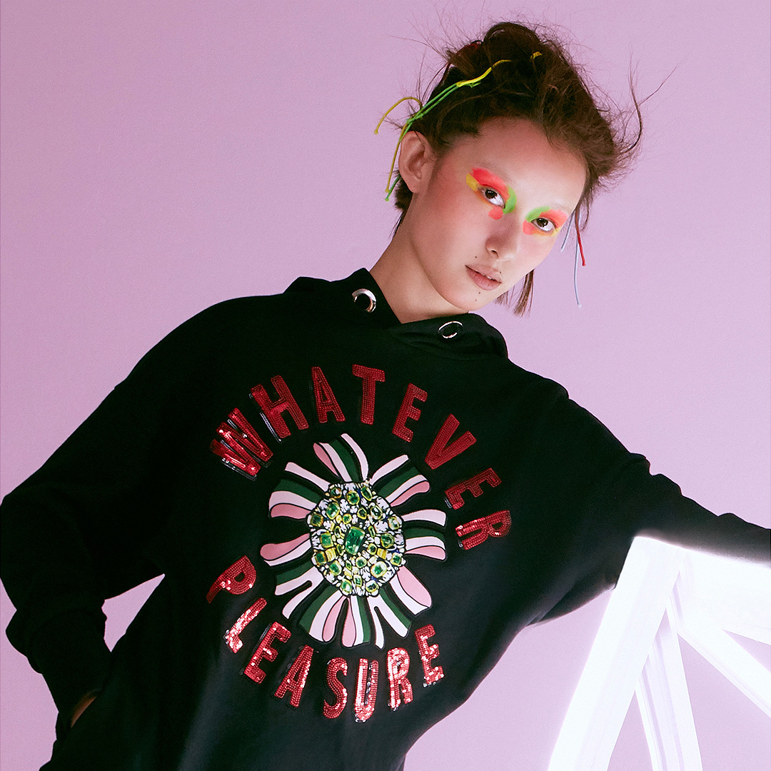 告别秋冬,面对即将到来的2017春季,E&joy将同样传递着属于自己的时尚态度。以多元化的时尚视角,玩酷的个性是E&joy 2017春季贯穿的主旨,同时呈现随性不羁的时装风格。当趣味十足的纯粹感碰撞艺术主义,前所未有的时尚冲击感迎面而来。 E&joy 2017趣味印花连帽卫衣裙