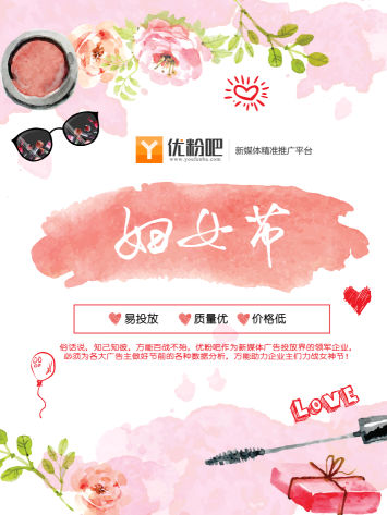 为此,优粉吧特别针对即将到来的女神节推出新玩法,整合微信、微博、视频、直播等多平台优质资源,为广大企业主们输送最精准的社媒营销资源和广告投放方案! 优粉吧女神节携手最火社媒账号,助力企业女神节营销快、准、狠! 1.你了解女神的消费习惯吗?你知道女神最喜欢买什么吗?你知道女神们都是几点钟下单的吗?这些优粉吧通通帮你搞定,通过女神的行为习惯数据分析,为您的产品在海量大号种精选出最适合的大号定投,保证你的每一个广告都正中女神下怀! 2.大数据分析助力企业优选账号,基于在资源层面的优势和实际广告交易数据积累,优粉吧面向广告主推出“易投放、质量优、价格低”的优质社媒资源,以帮助品牌方能更简易、更高效地进行传播。 3.营销不仅仅要创新,也要模仿,优质的营销是可以被模仿的,营销可以归结为20%的原创+80%的模仿,模仿别人的布局和切入点,加上自己的创新,就是一场优质的营销,优粉吧自成立以来 覆盖微信粉丝30亿,服务了超3000家的客户,有诸多成功的广告投放和营销案例,可以助力企业找到自己的案例模型,在女神节一击即中!