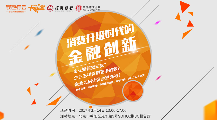 3月14日,由钱包行云、招商银行、中信建投证券、SOHO 3Q联合主办的《消费升级时代金融创新分享会》,将于北京朝阳区光华路SOHO2期3Q报告厅隆重举办。