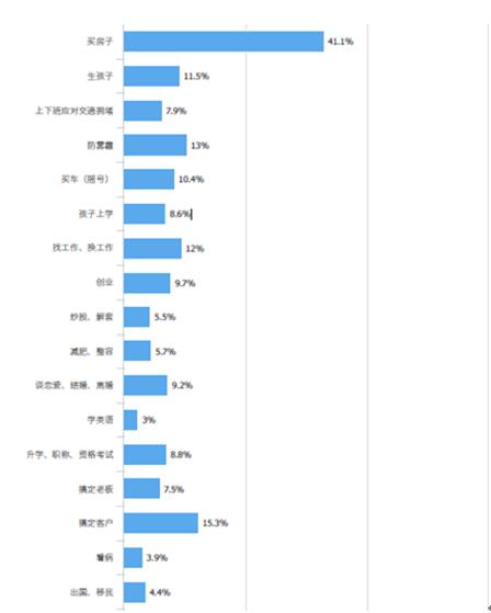 调查用户画像:高知人群对网络热词关注度更高 本次调查人群样本中,男性用户占48.4%,女性用户占51.6%,性别比例基本平衡。综合受访者的年龄、学历、收入、婚姻等数据可见,高知人群对网络热词的关注度更高,而婚姻状况对关注度影响不大。 从职业情况来看,房地产,金融,互联网,IT四大领域的用户占大多数。同时,已婚网民中,无子女的网民占比51.7%,有一个孩子的网民占比为37.1%,说明有两个或两个以上孩子的家庭相对而言容易无暇关注网络文化。总体看来,受访者在基本情况上呈现多样性,各年龄层、各类职业群体均有体现,在反映用户整体的使用热度及需求上具有较强代表性。 小目标篇:41%网友为“买房”用尽洪荒之力 大调查联合调查发现,2016年,41%的网友为了“买房”用尽了洪荒之力。而伴随着环境问题的日益严重,“防雾霾”以13%的关注度跻身前三。此外,“脱单”、“生娃”、“带孩子”也是众多网民们关注的“小目标”的关键词。