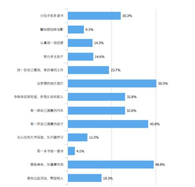 而在短期计划的“小目标”排行榜中,去梦想的地方旅行、健身保持健康和拥有自己的房子仍然是多数人追求的目标。近5成网友希望能够去梦想的地方旅游,48.8%则希望能够保持健康的身体。在不断升高的房价重压下,仍有超过4成网友希望在未来1-5年内能够实现“买房”的计划。此外,读书、看电影、参加公益等有益身心的精神层次的追求榜上有名。由此可见,网民们除了满足生理与安全的需要,已开始追求实现自我的高级需求。
