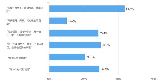 而在经济需求目标上,有57.4%的网友希望能够在10年后实现百万+年薪。通过对比2017年和2020年网友们期待实现的年收入数据不难发现, 2017年希望实现百万+年薪的网友占24.9%,2020年,该占比上升至60%,上涨率达140%。这一数据也体现出了中国网民对于未来经济,个人财富积累的超强信心。 浪漫情怀总是诗, 54.4%的网民认为“面朝大海,春暖花开”就是幸福。与亲人保持联系、环游世界、美好的前程等也是网民们获得“幸福感”的重要来源。