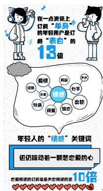 国民情感图谱:单身和出轨话题热度高涨 离家在外的年轻人被七大姑八大姨催婚已成最典型话题。从一点资讯发布的2016年国民情感图谱可见,在一点资讯上订阅“单身”的年轻用户是订阅“表白”的13倍。对年轻人来说,单身是种新常态。同时,年轻人的情感关键词包括爱情、出轨、闺蜜、外遇、结婚、分手等,内涵丰富、精彩纷呈。尽管如此,恋爱频道的订阅仍然是失恋频道的近10倍,年轻人单身常态下渴望恋爱的心态展露无遗。