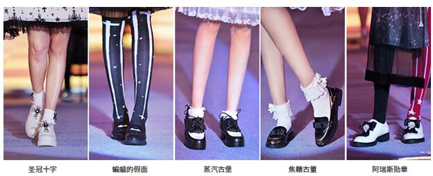 “圣冠十字”:精美可摘取十字架,厚底增高,布洛克花纹让整款鞋的设计包涵着梦幻般的华丽; “蝙蝠的假面”:图案象征着独一无二的爱,乐福鞋型融合硬朗的配色,个性又勇敢; “蒸汽古堡”:金属机械感mix铆钉蕾丝,厚底增高搭配弧度感强的鞋型,带着朋克与性感向你袭来! 焦糖古董:焦糖色搭配擦色设计,简约乐福鞋加上蝴蝶结点缀,梦幻至极。穿上它,也许会有一阵浓郁的焦糖香味飘来; “阿瑞斯勋章”:战神阿瑞斯是勇敢的象征,该鞋以白色作为主色调设计,实穿的简约鞋型,可替换的勋章和蝴蝶结配饰增加华丽感,穿上它,拥有爱情和勇气!