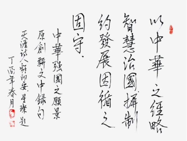 释印安入编典籍 《中华强国之愿景》 未来中国,真正强大,任重道远,求索实现。 期愿中国,如此强大: 中华文化振复兴,华夏精神激昂扬,科学与技术达昌明,仁义礼智信得回归。以中华之经略智慧治国,摒制约发展因循之固守。自强不息,奋发图强。教育弃产业化而力行国家之义务,少年强则中国强;医业转利益心以坚持济世之操守,全民健即中国兴。师德重树,传道授业;医界应弘,中医瑰宝。各行领域,异彩纷呈;中华大地,欣欣向荣。热爱疆国之山河,莫使大地深受污染;保护自然之环境,拥有美好绿色家园。百姓安居,得享天伦之乐;人多乐业,发挥创造才能。珍惜物命,效用资源;爱护生态,持续发展。良性循环,岁月长流;日月清明,山川锦绣。 江河清澈,海蓝空澄; 鹰飞燕舞,渔歌晚唱。崇尚自然天人合一观念,遵从天道物理宇宙法则。生态农业果粮丰收,绿色保健;社会事务评鉴处理,效行法理。军力强而实卫和平,法治效则确保安邦。国之领袖,勇担天下之大任,习习春风,展世界王者仁义博爱之风范;淳善人民,具有全球之视野,意气欢欣,向海陆丝绸经济长带而奋行。宏图中国梦,实现中华梦!中国强大,贡献世界;共享共荣,全球欢腾。各国向往,百川归海;礼尚往来,世界大同!如此中国,方为强大;至实现时,振奋伟哉!