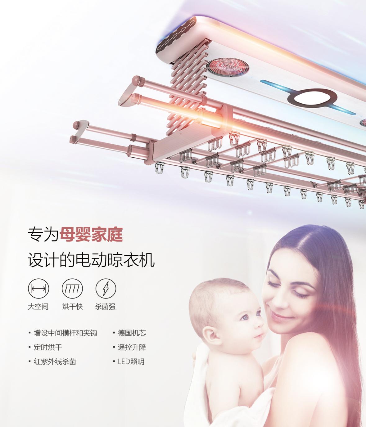 更有六大技术的升级,为晾衣机带来了新式光波杀菌、智能式柔和干衣不伤衣、更高强度材质超大承重、独特的弧形晾杆更省心省力、负离子净化智能烘干、优雅LED晾衣氛围灯。从而确保了晾衣机最核心的体现得以完美展现,让使用者轻松享受智能晾衣生活。