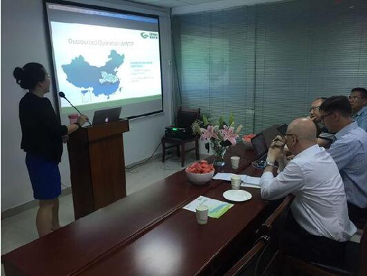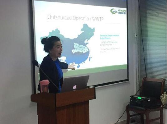 格林环保CEO姜琦介绍公司发展历程 格林环保CEO姜琦向大家作PPT讲解 当日下午16时许,在姜琦的陪同下,英国利洁时集团考察团参观了格林环保公司污水处理站和行政管理办公楼。姜琦全程运用流利的英文向考察团客户介绍了格林公司自主研发的污水处理运行管理模式和污水站运营业绩案例,并举行了现场交流会和污水处理运维的运作观摩。