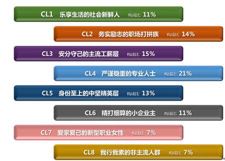 出处:DACCS2016年调查数据 DACCS 2016年调查结果: 【族群①】:乐享生活的社会新鲜人 “乐享生活的社会新鲜人” 代表的是初入职场的90后(2016年17岁-26岁),他们是活在当下的社会新鲜人,他们依赖原生家庭,但期待自我独立。 该族群属于德系高价位段大型三厢车用户或意向者,他们希望通过车体现稳重的自我、富有朝气的自我、个性的自我。 该族群通常因为休闲娱乐购车,他们把车作为休闲/娱乐的必备品,主要考虑车的休闲/娱乐用途。他们购车最重视车的品质(故障率等)、舒适性、款式外观,也重视车的价格,但更关注性价比。 【族群②】:务实励志的职场打拼族 “务实励志的职场打拼族” 代表的是职场打拼初期阶段的85后(30岁前后)工薪族,他们是务实的职场打拼族,需要更多关注,正努力奋斗走向成功。 该族群属于自主系低价位段小型SUV的用户或意向者,他们希望通过车体现漂亮的自我、帅气的自我。 该族群通常因为人生阶段发生改变而购车,他们把车作为社会人的必备品,主要考虑车的功能及商务用途。他们购车最重视车的价格,也重视车的便利性、车内空间以及驾驶性能。 【族群③】:安分守己的主流工薪层 “安分守己的主流工薪层” 代表的是事业已经步入正轨、过着稳定生活的80后和90后小夫妻,他们是圈子意识强烈的主流工薪族,思想保守和传统,安分守己地生活和工作。 该族群属于法系低价位小型两厢车用户或意向者,他们希望通过车体现自己是大城市的人、自己的富有、重视环保的自我。 该族群通常因为开始工作而购车,他们把车作为高科技产品,主要考虑车的功能用途。他们购车最重视车的便利性和经销店的供货情况,也比较在意品牌、车的与众不同以及口碑评价。 【族群④】:严谨稳重的专业人士 “严谨稳重的专业人士” 代表的是具备专业技能的80后,他们是专业技能超群的专业人士,对工作充满自信,喜欢高科技产品。 该族群是美系中档价位的中型三厢车用户或意向者,他们希望通过车体现自己是大城市的人、自己的身份地位。 该族群通常因为个人工作需要而购车,他们把车作为商务出行工具,主要考虑车的商务用途。他们购车最重视车的品质(耐久性等)和销售人员的可靠性,也比较关注驾驶性能和外观设计。 【族群⑤】:身份至上的中坚精英层 “身份至上的中坚精英层”代表的是已经成家立业的70后及80后男性,他们是精明能干的社会精英,他们享受现在的生活,但更希望突破现状。 该族群属于日韩系中档价位段中型三厢车用户或意向者,他们希望通过车体现自己的富有、自己的身份地位。 该族群通常是为了获得周围人认同而购车,他们把车作为身份地位的象征,主要考虑家庭用途。他们他们购车最重视车的便利性和驾驶性,更关注周围人认可的车。 【族群⑥】:精打细算的小企业主 “精打细算的小企业主” 代表的是以个体/私营为主的70后(2016年37〜46岁)男性,他们是能够把握机会的精明小业主,希望通过各种方式提升自己在他人心中的形象。 该族群属于美系高价位段大型SUV用户或意向者,他们希望通过车体现自己的成功、时尚的自己、自己的先进性。 该族群通常是为了自己的实际需求而购车,他们把车作为日常交通工具,主要考虑自己日常使用(个人和家庭)。他们购车最重视车安全性和性价比,也关注外观设计及降价优惠信息。 【族群⑦】:爱家爱己的新型职业女性 “爱家爱己的新型职业女性” 代表的是新时代的70后女性,她们是爱家爱己的新型职场女性,思想传统,花钱谨慎,希望自己时刻保持最佳状态。 该族群属于德系低价位段小型三厢车/两厢车用户或意向者,她们希望通过车体现对家人的关心。 该族群通常综合考虑各方面需求(个人/家庭/工作)再购车,她们把车作为生活的必需品,主要考虑外出办事方便(个人/家庭/工作)。购车重视因素很多,最重视车的安全性和品质(质量/工艺等),也非常关注车的养护费用,希望购买性价比高的车。 【族群⑧】:我行我素的非主流人群 “我行我素的非主流人群”族群代表的是关注内心的70后及部分90后男性,他们是拥有自我信仰的非主流人群,自我意识强烈,追求品质生活。 该族群属于德系中高价位段中大型SUV和日系中低位段中小型三厢车用户或意向者,她们希望通过车体现对家人的关爱、稳重的自我、富有朝气的自我。 该族群通常因为个人需求而购车,他们把车作为自己的兴趣爱好,主要考虑个人用途。购车重视因素也很多,最重视乘坐舒适性、品质(故障少等)、安全性,也非常关注车的性价比。 |