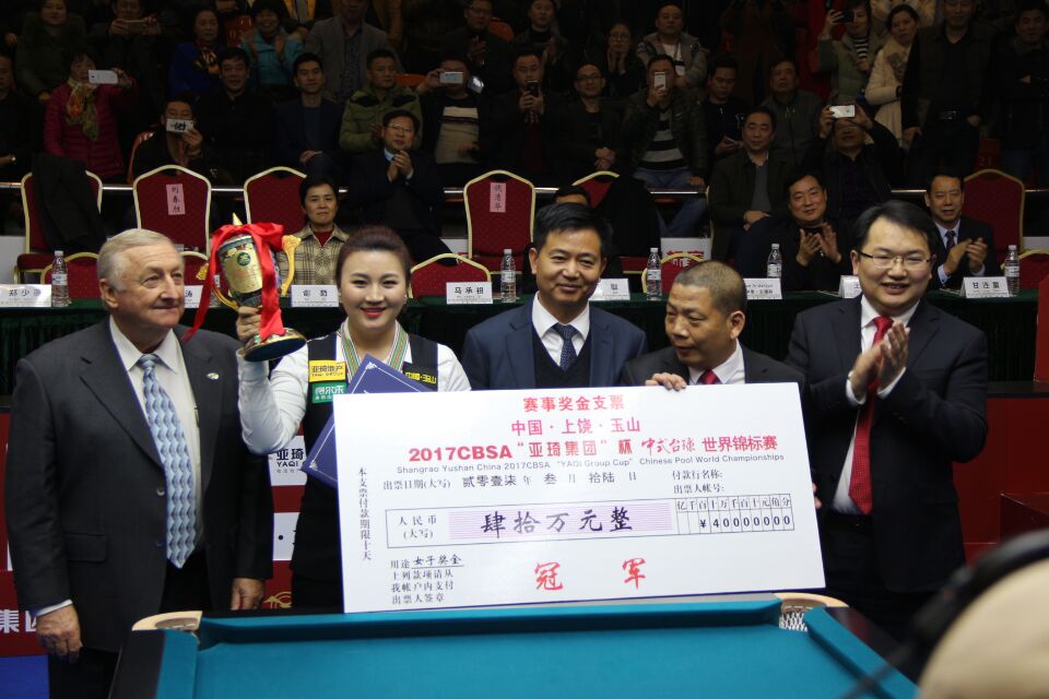 2017年3月16日,中国·上饶·玉山2017CBSA“亚琦集团”杯中式台球世锦赛圆满落幕,杨帆、付小芳分别摘得男、女组桂冠。本次赛事创造了多个世界之“最”——国际组织最多、参赛国家最广、冠军球星最多、跨界最大、场次最多等。在10天的时间里,来自41个国家和地区的近400名高手,为全世界观众演绎了747场赛事盛宴。在世人眼里,中式世锦赛更像是台球界的“奥运会”。