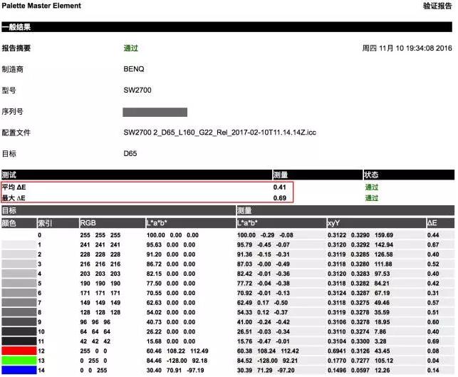 第二点:色彩准确的重要性 达到色域够宽广,你的显示器已经超越了市面上80%的桌面显示器,如何超越那剩下的20%?这就要看一个重要的指标——色彩准确度。 专业摄影师对色彩精准度都不陌生,色彩精准度DeltaE决定了人们对色彩的感知,这个数值越小代表显示器的色彩表现越接近标准颜色,一般认为DeltaE<3才能称为专业级显示器。但SW2700PT却能保证每个色域均做到DeltaE<2 下图是自用的明基显示器SW2700PT进行硬件校色后的专业结果: DelteE平均值0.41最大0.69,色域100%AdobeRGB+sRGB。明基专业摄影显示器能真实重现照片的原貌,减少图片传递时的色差,让色彩过渡更加自然。