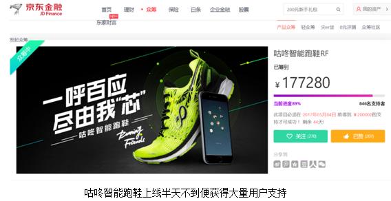 目前,咕咚智能跑鞋RF众筹价格和档位设置比较丰富:支持1元,每满199位支持者抽取1位幸运用户,将会获得咕咚智能跑鞋RF一双;支持199元可获得咕咚智能跑鞋RF 1双;支持259元可获得咕咚智能跑鞋RF 1双 + 咕咚品牌运动袜3双套装;支持299元可获得咕咚智能跑鞋RF 1双 + 咕咚品牌背袋包;支持458元可获得咕咚智能跑鞋RF 2双+咕咚运动水壶1支;支持2985元,可以获得咕咚智能鞋RF15双,享受大客户专享待遇。 值得注意地是,咕咚智能跑鞋RF一上线便获得了众多跑友追捧,半天不到时间,已经有超过800多人支持,众筹金额超过17万元,完成目标89%。 无独有偶,最近小米众筹也上线了一款90分 UItra Smart智能跑鞋,同样可以通过内置鞋底的芯片,检测用户运动时的各项数据,包括路线、距离、配速、卡路里等,但众筹价格定在299元。相比之下,咕咚智能跑鞋众筹价格199元则显得更具吸引力。 实时语音指导 主打日常跑步训练 作为一款智能跑鞋,当然功能需要更加智能地帮助用户。 咕咚智能跑鞋RF搭配了实时智能语音指导功能,用户需要携带智能手机,芯片通过咕咚APP与跑鞋连接。跑步过程中,芯片会实时捕捉、监测脚掌落地的步频、步姿变化,手机同步发出语音提示,纠正跑友步姿不当、步频起伏过大等毛病,第一时间调整到位,堪称时效性最强的“随身教练”。 咕咚智能跑鞋RF中的智能芯片可记录距离、时长、配速、卡路里、步频、步幅、步数、缓冲力、平均触底时间、着地比例、步态比例等多个维度的运动数据。 该智能芯片采用咕咚独有智能算法,结合ADI军用级传感器,确保运动数据采集的高精度。芯片密封性能极好,防水等级达到IPX7,即使下雨天跑步,也无需担心浸水导致芯片停止工作。同时芯片电池可以更换,续航时间长达8个月。 此外,芯片可以独立监测、完整记录跑步数据,用户只需穿上咕咚智能跑鞋RF,就能在不携带手机和智能手表的前提下跑步,尽情享受超轻量“裸跑”的乐趣。跑步结束后,在网络环境下,记录的运动数据会自动同步到咕咚APP。 颠覆传统 将社交植入跑鞋 实际上,咕咚智能跑鞋RF最大的特色并非语音实时指导,而是将社交功能植入到了跑鞋里。这完全颠覆了用户对传统跑鞋的概念。 有细心的用户可能会看到,其实咕咚智能跑鞋中的“RF”字母就是来自Running Friend的简写。