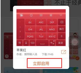 换上红色新皮肤,与周围小伙伴的手机页面迅速区分开,成为周围最耀眼的一抹红!想必大家已经迫不及待的想要更换皮肤了。启用的方式非常简单。现在只要打开搜狗输入法手机版,首页已经显示了“苹果红”的新键盘,轻轻一点,就会出现“立即启用”字样,再点击“启用”就大功告成。