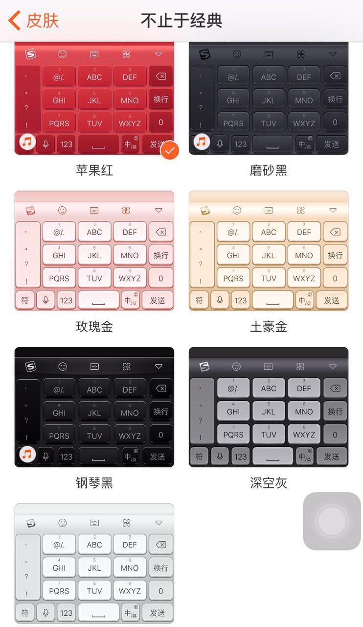 搜狗输入法手机版此次推出的“不止于经典”的新皮肤包含“苹果红、磨砂黑、玫瑰金、土豪金、钢琴黑、深空灰以及银色“等7种颜色。小编相信这7种充满质感的颜色一定有一款或几款俘获了你的心。 目前,这一系列皮肤已经上线了,大家快快去更新启用吧。除了通过搜狗输入法APP来更换皮肤,也可以直接扫描下方二维码一键更换。相信不止于经典的特别的“键”一定会给你带来特别的“红运”!