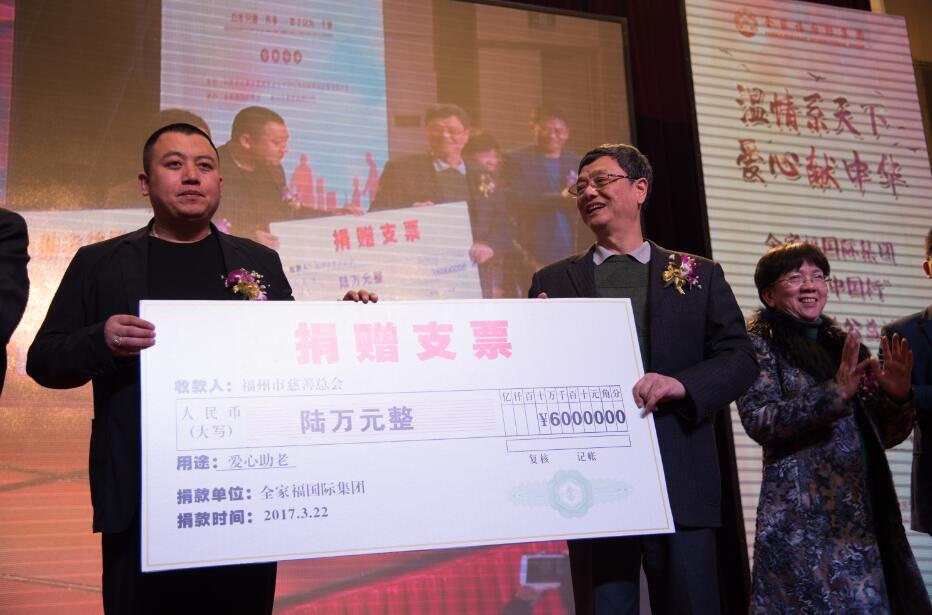 3月22日,由中国老龄事业发展基金会夕阳红为老服务项目管理委员会主办、全家福国际集团、老妈乐商贸有限公司承办的温情系天下,爱心献中华一一全家福“温暖中国行”大型慈善公益活动在福建省全面展开,对福建福州慈善总会,福建福州五区慈善总会慈善机构机构进行了捐赠。