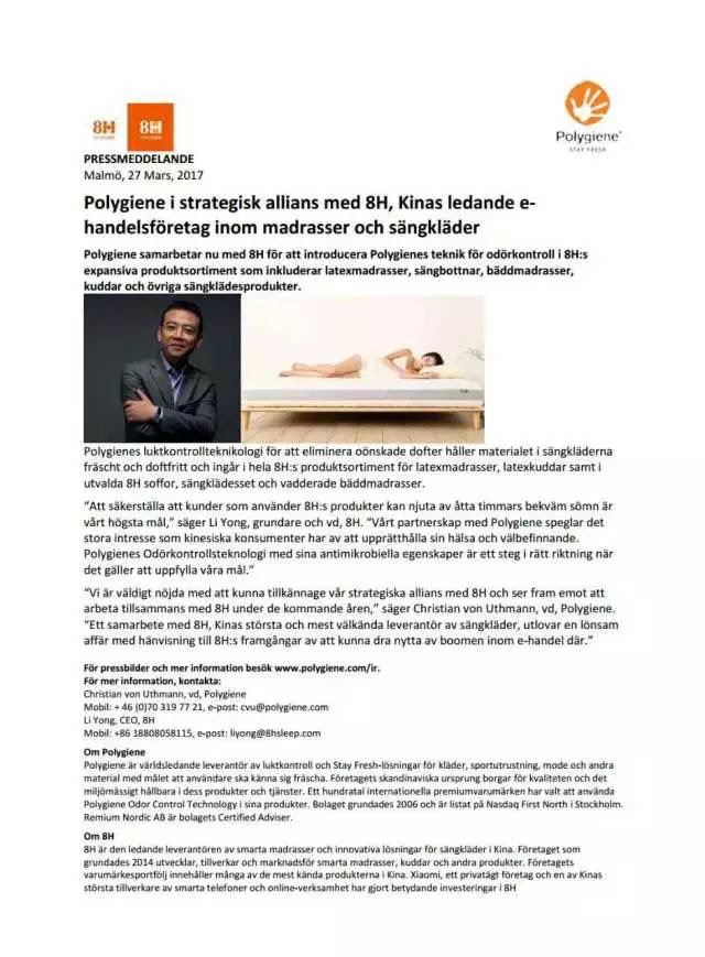 瑞典上市公司polygiene是全球非化学性抗菌剂龙头公司,高端品牌首选。polygiene公司年报中强调来自中国的8H已经是公司全球最大用户之一。