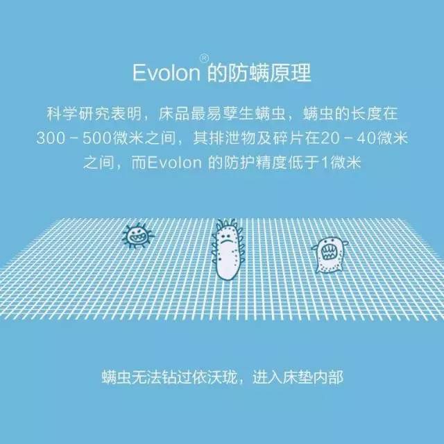普通床品易滋生螨虫,螨虫的长度在300-500微米之间,其排泄物及碎片在20-40微米之间,Evolon的防护精度低于1微米,能够有效做到物理防螨。
