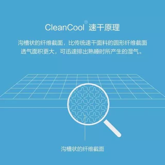 8H运用的CleanCool速干原理,沟槽状的纤维截面,比传统速干面料的圆形纤维截面透气面积更大,可迅速排出熟睡时所产生的湿气。