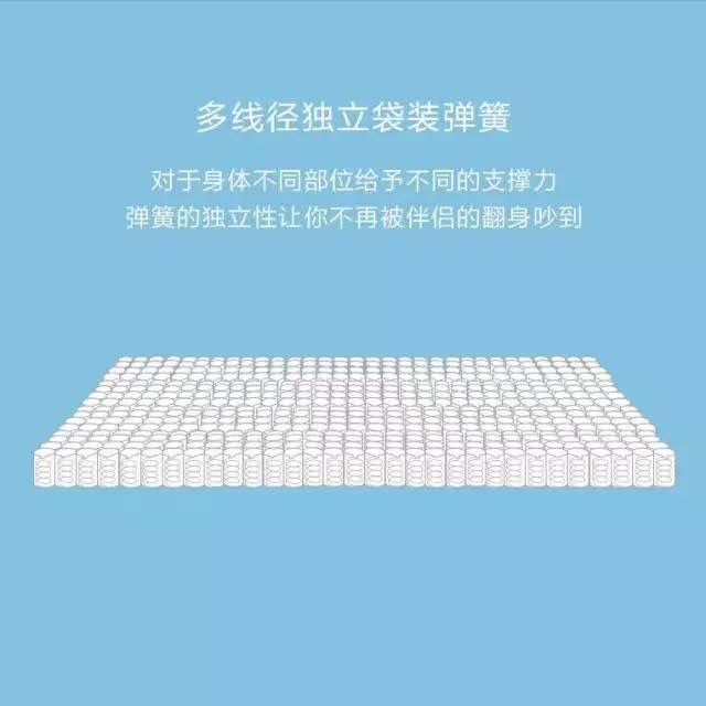 多线径独立袋装弹簧,对于身体不同部位给予不同的支撑力,弹簧的独立性让你不再被伴侣翻身吵醒。