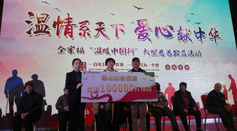 3月22日,由中国老龄事业发展基金会夕阳红为老服务项目管理委员会主办,全家福国际集团、老妈乐商贸有限公司承办的温情系天下,爱心献中华一一全家福“温暖中国行”大型慈善公益活动在河北省全面展开,本次活动对唐山市、廊坊市、石家庄市、保定市、沧州市、秦皇岛市、邯郸市的养老机构进行了捐赠。
