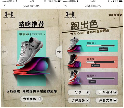 近日,咕咚(Codoon)和安德玛(Under Armour)携手推出主题“UA邀你跑出色”的线上活动,短短两周内获得了将近90,000咕咚用户的追捧,总跑量超过30万公里,目前还在不断上涨。这项活动号召跑友“为心目中最佳跑鞋而战”,需要跑友使用咕咚APP,用日常锻炼的跑量,为心目中的安德玛跑鞋产品助跑。获胜用户将抽取对应派别的跑鞋作为礼物,参与者均能获得金额不等的优惠券。 记者在咕咚APP上看到,安德玛此次活动主打的三款跑鞋当中,缓震派GEMINI 3最受跑者欢迎,以160,921公里的助跑里程,遥遥领先于稳定派EUROPA和轻质派VELOCITI。自从咕咚Running Girl开创“线上助跑”概念之后,这种参与活动的方式开始成为线上运动主流,而业界关注更多的是咕咚和安德玛的合作。