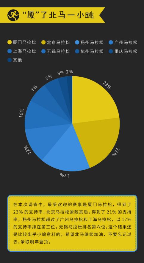 赛事热度在2017年首先有了改变:厦门马拉松以2个百分点的优势,逆袭北京马拉松成功,跃居全国头牌。联想到最近两年的全国城市空气质量对比,不难理解厦马为何能后来居上。排在第三的是扬州马拉松,这张城市名片对扬州的发展起到了至关重要的作用。