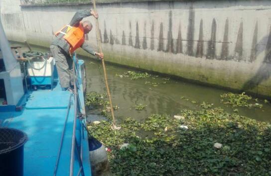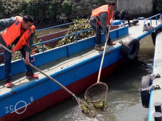 灵活轻快的小船穿梭往来,侨银环保的保洁员熟练地用捞网将水浮莲一点点捞起。