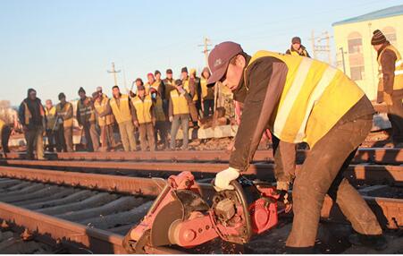 每次的朝阳普照,都是胜利的曙光在招手,工人正在锯轨。