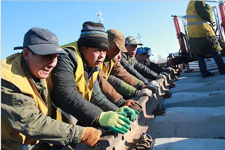 众心齐,泰山移。工人正在抽滑轨。