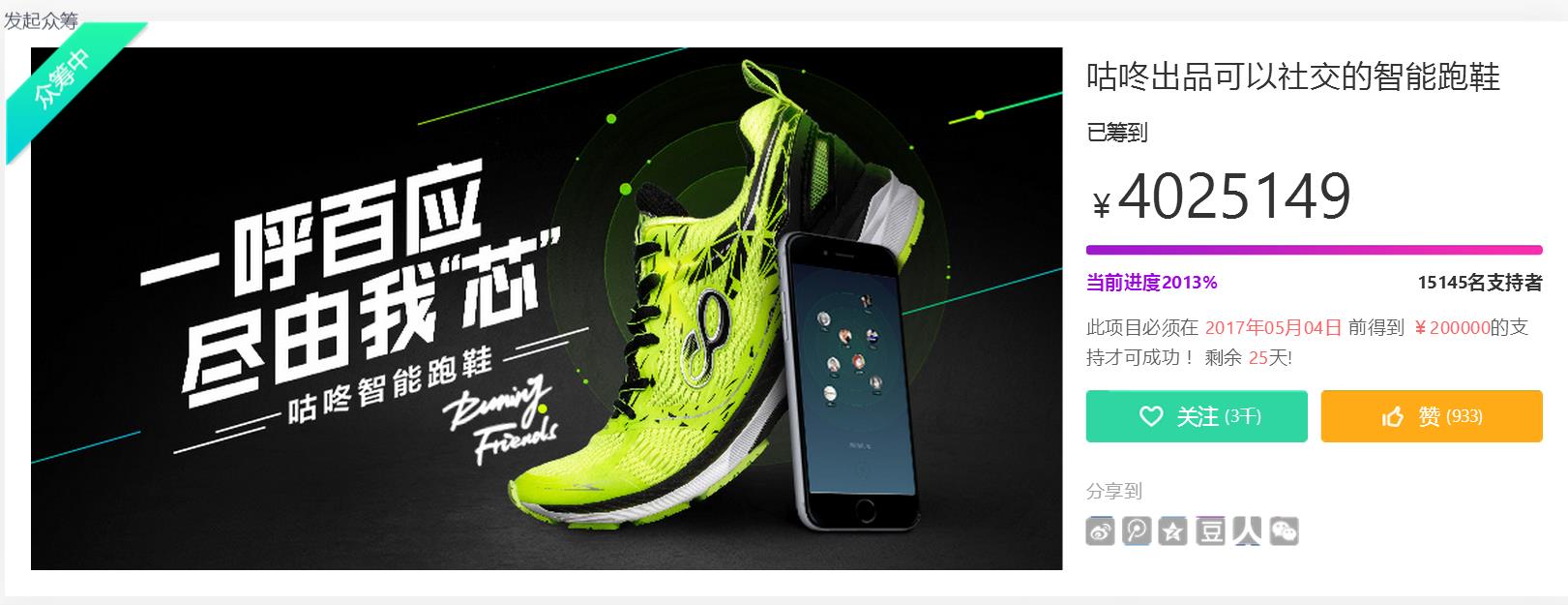 4月9日,咕咚智能跑鞋RF在京东众筹金额突破400万元,完成众筹目标金额2000%,超过15000名支持者“认购”。 在此之前,这款可以社交的智能跑鞋在京东众筹一上榜,就引发了用户的追捧,7天之内目标金额即超过200万,199元认购一双的众筹价格档位,500个名额数次供不应求,京东在连续补档的同时,也将名额上限提升到1500个,但依然被跑者刷爆。