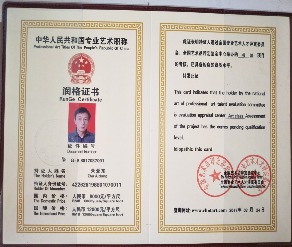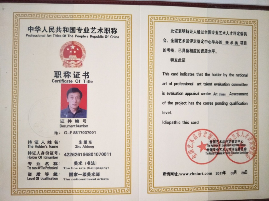 2017年,由全国专业艺术人才评定委员会、全国艺术品评定鉴定中心联合评审,朱爱东同志提交的国家一级美术师相关艺术品作品申请材料,经严格审核认证程序,已具备相应资质水平,授予朱爱东同志国家一级美术师职称证书。