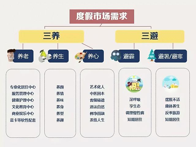 健康是人类,永恒的主题,不仅关系着每一个人的幸福,也与国家的进步与民族的兴衰息息相关。健康、养生或养老需求势必会成为人们未来的主流需求,而中共中央国务院印发《健康中国2030”规划纲要》则把健康推向一个新的高度,为健康产业的发展提供了有力的支持,也在新时期、新形 势下,为康养特色小镇的开发建设指明了方向。 什么是康养小镇? 康养小镇是指以“健康”为小镇开发的出发点和归宿点,以健康产业为核心,将健康、养生、养老、休闲、旅游等多元化功能融为一体,形成的生态环境较好的特色小镇。 康养小镇可以根据旅游者、居民的消费需求,将健康疗养、医疗美容、生态旅游、文化体验、休闲度假、体育运动、健康产品等业态聚合起来,实现与健康相关的大量消费的聚集。 当前随着大众生活水平的提高,休闲度假在旅游总人次中占的比例大幅提升,旅游度假正在成为未来的主流。旅游度假作为新时期的一种旅居生活方式,包含观光、休闲及各种文娱体康养等消费,追求健康和精神享受,逐渐成为休闲生活主流。 “三避三养(避暑避霾避寒、养生养心养老)+微度假”是对旅游度假需求的集中诠释,是旅游度假发展的重要方向,也是旅游休闲度假的核心市场,可以催生一系列新型业态和产业链,成为新时期经济突破发展的一种新模式。“旅游+康养”正在成为未来小镇的新走向,可以催生一系列新型业态和产 业链,有着单一功能小镇所没有的魅力。