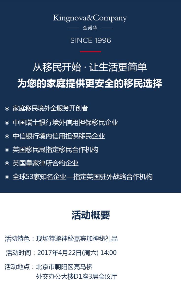 随着“脱欧”会谈的正式开始,移民相关的负面新闻五花八门。关于“如何留英”这个问题,最近关注的人越来越多。这些人基本可分为以下3类: 1. 在英读书或工作,想继续留英,直到拿到永居; 2. 在国内工作,但对英国非常向往,希望有机会移民英国 3. 考虑以爱尔兰为跳板,希望在英爱两国畅通无阻的生活学习 英国企业家移民靠谱吗?靠谱! 金诺华英国梦想企业家 英国企业家移民项目近年来颇受移民者的喜爱,仅需投资20万英镑,先获批后投资,一人申请,全家移民英国。如此高性价比的移民项目,随着英国形势的改变,现在也相应作出了新的变动。原有的投资金额不变,签证申请条件要求变得更加严格。 对于T1企业家签证的办理,或许很多人唯一的顾虑,就是传说中的拒签率。的确,在移民局内部颁布的2016年英国签证数据表中,T1企业家拒签率却达到56%,创下近两年以来最高。其实并不奇怪,申请的人越多,拒签的理由也就越五花八门。 虽然拒签率如此之高,但是,金诺华移民还是可以通过以下方式帮助你以100%成功率顺利拿到英国企业家签证! “0”拒签方案:不论客户被以任何理由被移民局拒签,我们都会免费为客户重新申请英国雇主担保移民项目。双重保障,确保客户能够成功圆梦英国。 一对一面试指导:我们经验丰富的移民专家团队会结合每个人的实际条件,谨慎地设计创业移民方案;并且针对面试官可能会问到的一系列问题进行多轮面试指导。 锁定最佳投资项目,获取最大收益:我们会根据投资者背景,去推荐符合移民局要求的优质企业,投资者入股到该企业,作为合伙人,对企业进行管理运营。让移民英国的5年间,达到身份+投资收益+行业经验的多重收获。 小投入移民欧洲,来英进出自由 金诺华全新爱尔兰30万欧元投资移民 虽然很多人心心念念地想要留在英国,不过你必须要理解“缩减移民”是英国政党的“执政根基”。也正因此,越来越多的人把目光投向了英伦三岛上的翡翠之国——爱尔兰。 而今年年初,由于大量爱尔兰移民项目的火热,移民局将原本50万欧元的投资额提升至100万欧元。资金一下翻倍,让很多投资人一筹莫展。 金诺华独家30万欧元融资方案:该方案由政府监管,“先审批,再投钱”的方式可以最大程度地保证投资者的投资安全。 在居住要求方面,爱尔兰仅要求12个月来访一次,不需要像其他欧洲国家那样连续居住长达半年以上。 除此之外,爱尔兰经济发达,是欧洲人均最富裕的国家也是高福利国家,拥有爱尔兰身份以下福利均可兼得: 全英义务教育:和欧洲各国相同,大学前义务教育均为免费,但与欧洲其它非英语母语国家不同,子女不但从小接受全英文教育,无需再学其它小语种。 优势进入世界名校:子女在申请世界名校上优势明显,不但能比英国爱尔兰以外的国际学生更容易申请到两国顶尖大学,还能以华侨身份回国参加“华侨港澳台联考”,与国内同届考生相比更低分数进入中国北大清华热门专业。 免费医疗:不仅享受免费医疗还能享受欧洲各国同等的诸多社会福利。 享受更自由的工作和生活:由于爱尔兰和英国之间一衣带水的紧密联系,你和家人移民爱尔兰以后可以自由在英国或者其他欧盟国家工作生活。 永久中立国:国家政策“永世中立”,安全,稳定。 爱尔兰移民政策大变,门槛或将更高 英镑汇率初显反弹趋势,投资一要趁早 金诺华 · 因“爱”而生 投资移民说明会 2017年4月22日(星期六)