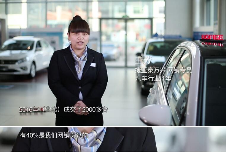 虽然名为宣传片,然而片中邀请到的采访对象都是真实奋斗在经销商一线的从业者,这其中有入行刚刚一年的新鲜人,也有扎根行业30年的资深“汽车人”。为了更加写实的反映行业中人的心声,宣传片除预设了几个问题,全程不设脚本。 从两部宣传片中我们可以看到,这些经销商在面对市场环境的变化中,携手博福易商,积极寻求到了一条变革之路。以捷亚泰万兴为例,博福易商从选人、培训、协助部门经理制定KPI开始,亲手搭建起来成熟的网销部门。一年的运作后,不仅全店销售业绩增长了50%,利润更是超额增长了34%。本该只是外人眼中入行才一年的“菜鸟”——网销专员王芳,都可以在访问中自豪的表示:“我们全店2016年成交2000多台,其中40%的业绩是网销部门贡献的!“