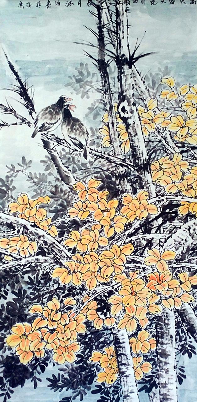 结识冯泊之前,我在《美术大观》、《美术研究》、《中国书画报》上品读过其工笔画作品,留下了深刻的印象。8年前的一次偶然的机会,我走进了他的画室。一幅充满生机的工笔花鸟画还躺在画板上,画中彰显着“美”与“雅”。综观冯泊的作品,我们似乎可以看到他工笔画的单纯性特征。这种单纯性不是简单、简率,而是形象塑造上的概括和符号性形象的重构。成就一幅作品不可仅仅满足于个性化的图式,还需“超然象外”与“迁想妙得”。