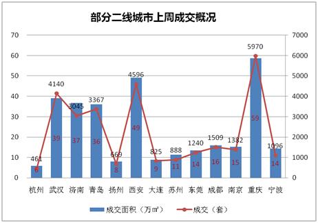 监控的16个二线城市中,济南、青岛、苏州等城市上周(4.10-4.16)成交面积和成交套数环比前一周上涨,济南上周商品住宅成交3045套,成交面积约为36.77万平方米;青岛上周商品住宅成交3367套,成交面积约为36.01万平方米;苏州上周商品住宅成交888套,成交面积约为11.38万平方米;南京、重庆上周成交下滑,上周南京商品住宅成交1382套,成交面积约为15.22万平方米,重庆商品住宅成交5970套,成交面积约为58.74万平方米。