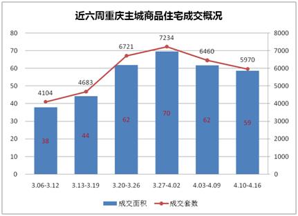 重庆——上周18盘推新 住宅成交5970套小幅回落 上周(4.10-4.16)重庆商品住宅成交5970套,成交面积为58.7万平方米,成交均价为7721元/平。从各区商品住宅成交情况来看,上周各区成交套数均有明显的减少,仅大渡口、九龙坡、北碚三个区域的成交套数有小幅度的环比增长,渝北区和巴南区成交套数破千套水平线;各区成交均价方面,南岸区3月的网签成交均价为重庆主城九区成交均价第二,超越江渝北区,而上周江北区成交均价一跃至建面万元水平线以上,力压南岸区。