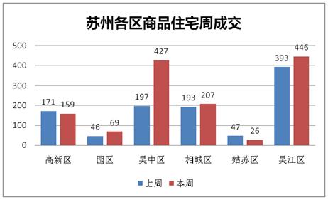 苏州——环涨27.41%! 上周苏州住宅成交1334套 据房天下数据监控中心统计数据显示,上周苏州市区商品住宅共计成交1334套,环比增加287套,增幅为27.41%。成交面积16.6万平方米,环比增加3.8万平方米,增幅为29.31%。从苏州市各区来看,上周苏州各区域住宅成交大部分都是呈增长趋势,其中吴中涨幅较大,达到了427套,增长了230套,增幅超过100%;而吴江的住宅成交量在上周较高的基数上又有了提升,达到了446套,另外园区、相城的周成交量分别为69套和207套,也有一定的增长。