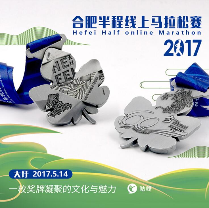 这同时是一场充满地标元素的线上跑。原因只有一个:奖牌太给力。创意源于大圩本地特色果树——葡萄,整体造型为一片葡萄叶,以此体现当地的原生态自然之美。奖牌金属质感十足,上方凹面刻制“HEFEI大圩”,左下角和背面的几株葡萄是点睛之笔,饱满成熟的葡萄寓意美满富足、硕果累累,暗喻跑友的马拉松之路收获满满,以此传达美好的祝愿。 由于2017年是合肥做为中国马拉松发源地的60周年,奖牌背面的“60”字样饱含了中国马拉松踏过的历史,不仅浓缩了大圩当地特色,还有跑马历史回顾,值得每一位跑友珍藏留念。